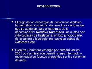 Las licencias Creative Commons permiten a los creadores compartir su trabajo y permitir ciertos usos por otros, como uso no comercial o creación de obras derivadas. Se componen de cuatro elementos (reconocimiento, no comercial, compartir igual, sin obra derivada) que pueden combinarse para crear seis tipos de licencias. Permiten compartir contenido en Internet de forma legal y flexible, respetando los derechos de autor del creador.