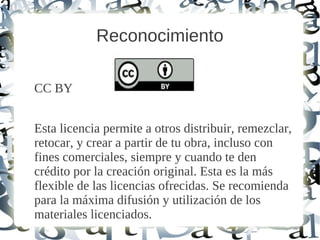 Este documento describe las diferentes licencias Creative Commons que permiten a otros distribuir, remezclar y crear obras derivadas del material original de diferentes maneras. La licencia CC BY permite el uso comercial siempre que se de crédito, mientras que CC BY-SA requiere que las obras derivadas se compartan bajo la misma licencia. CC BY-ND solo permite la redistribución sin cambios, y las licencias no comerciales prohíben el uso comercial.