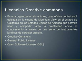 La organización sin ánimo de lucro Creative Commons, con sede en Mountain View, California, permite compartir creatividad y conocimiento a través de licencias gratuitas como Creative Commons, General Public License y Open Software License. Ofrece herramientas jurídicas para compartir contenido sin costo.