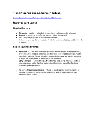 El documento recomienda usar la licencia Creative Commons Atribución-Compartir Igual 3.0 Unported para un blog. Esta licencia permite compartir y adaptar el contenido siempre que se dé crédito al creador y se comparta bajo la misma licencia. No se pueden imponer restricciones adicionales al uso permitido.