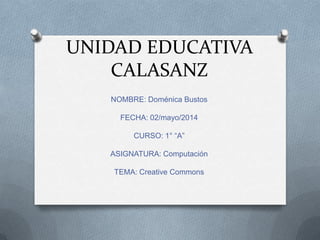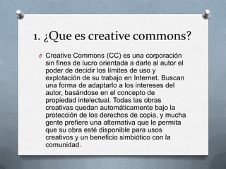 Creative Commons (CC) es una organización sin fines de lucro que ofrece varias licencias de derechos de autor que permiten a los creadores especificar cómo pueden usarse sus obras. Las licencias CC permiten el uso compartido y la creación de obras derivadas para fines no comerciales. Hay seis licencias principales que varían en si permiten usos comerciales, obras derivadas, y si las obras derivadas deben publicarse bajo la misma licencia.