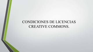 Este documento describe los tipos de licencias Creative Commons. Explica las condiciones básicas de reconocimiento, no comercial, sin obras derivadas y compartir igual. Luego detalla las seis combinaciones principales de licencias Creative Commons, las cuales varían en si permiten uso comercial, creación de obras derivadas y requisitos de licenciamiento.