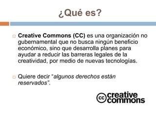 Creative Commons (CC) es una organización que desarrolla licencias para ayudar a reducir las barreras legales de la creatividad. CC ofrece 6 tipos de licencias que permiten a los autores compartir sus obras bajo ciertas condiciones, como permitir usos no comerciales o requerir el reconocimiento de la autoría. Las licencias CC brindan un modelo legal flexible para promover la educación, cultura y ciencia.