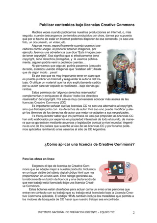 Este documento explica qué son las licencias Creative Commons y cómo se pueden aplicar. Define las diferentes licencias CC (atribución, no comercial, sin obras derivadas, compartir bajo la misma licencia) y cómo estas condiciones afectan el uso y distribución de contenido. También incluye iconos para identificar el tipo de licencia CC aplicada a una obra.