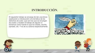 El documento explica brevemente los derechos de autor y las licencias Creative Commons. Define las licencias Creative Commons como una organización sin fines de lucro que crea leyes de propiedad intelectual para permitir que los creadores protejan su trabajo mientras permiten que otros lo usen bajo ciertas condiciones como dar crédito. Explica los pasos para usar una licencia Creative Commons en un blog y las diferentes combinaciones de licencias como reconocimiento, sin obras derivadas y no comercial. También lista recursos educativos disponibles bajo licencias Creative Commons.
