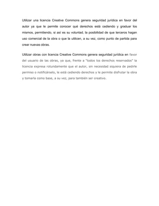 Las licencias Creative Commons tienen como objetivo permitir que autores y usuarios compartan y protejan obras de manera legal y transparente en Internet. Estas licencias establecen permisos específicos sobre el uso de las obras, como copiar, distribuir o crear obras derivadas, protegiendo los derechos de autor pero fomentando la generosidad y creatividad. El uso de licencias Creative Commons genera seguridad jurídica tanto para autores al especificar los derechos cedidos, como para usuarios al clarificar los permisos sobre el uso de las obras.