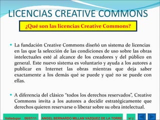 El documento describe las licencias Creative Commons y tres recursos educativos que utilizan estas licencias. Explica que las licencias Creative Commons permiten a los autores compartir sus obras bajo diferentes condiciones como reconocimiento, no comercial, sin obra derivada. Luego resume tres recursos educativos en línea, incluyendo un PowerPoint, un artículo PDF y un video, y las licencias Creative Commons que usan cada uno.