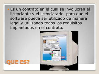 Este documento describe diferentes tipos de licencias de software, incluyendo licencias freeware que permiten usar software de forma gratuita y sin restricciones, licencias shareware que permiten compartir software por un tiempo limitado, licencias comerciales que requieren pago para uso comercial, el sistema operativo libre GNU creado para permitir modificaciones, y código libre que fomenta compartir software de forma ética.