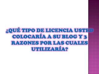 Este documento explica por qué el autor usaría una licencia de reconocimiento-no comercial-compartir igual para su obra. Esta licencia permite a otros copiar, distribuir y hacer obras derivadas siempre que reconozcan la autoría original y no la usen con fines comerciales o de lucro. Además, permite que obras derivadas se distribuyan bajo la misma licencia.