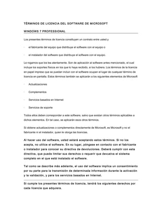 1. El documento describe los términos de licencia de software de Microsoft Windows 7 Professional. Incluye detalles sobre los derechos de instalación y uso, requisitos de licencia adicionales, activación obligatoria y validación periódica del software.