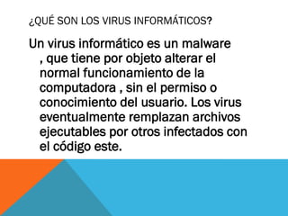 Los virus informáticos son programas maliciosos que alteran el funcionamiento normal de una computadora sin el permiso del usuario. Existen varios tipos de virus como gusanos, caballos de Troya, bombas lógicas y virus residentes. Los gusanos se propagan automáticamente entre ordenadores mientras que los caballos de Troya se disfrazan de programas legítimos. Los virus residentes permanecen ocultos en la memoria RAM y afectan los programas a medida que se ejecutan.