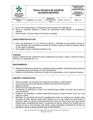 Este documento proporciona información técnica sobre una licuadora industrial, incluyendo sus especificaciones, instrucciones de uso, mantenimiento y limpieza. La licuadora tiene una capacidad de 15 litros, motor de 2 HP, y se usa para licuar frutas y verduras en la elaboración de jugos y salsas.