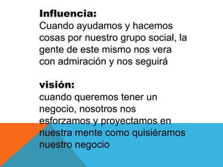 El documento habla sobre conceptos relacionados con el emprendimiento como influencia, visión e iniciativa. Explica que la capacidad de influencia requiere autocontrol y buen manejo para ganarse la admiración de los demás. También menciona que el liderazgo está asociado con la autoridad para lograr influencia sobre los demás. Finalmente, elabora una lista de cualidades como la responsabilidad y visión que debe tener un líder.