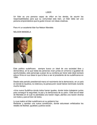 Un líder es alguien que influye en los demás y asume responsabilidades para el bien de su comunidad a través de ideas innovadoras. Nelson Mandela fue un excelente líder que luchó por la democracia y la igualdad en Sudáfrica a pesar de su encarcelamiento, y como presidente en 1994 trabajó para crear una nación justa para personas de todas las razas.