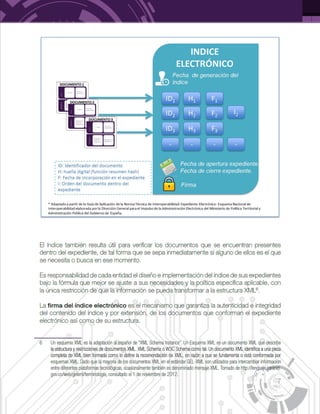 Este documento presenta una guía sobre el expediente electrónico en la administración pública. Define el expediente electrónico y sus componentes principales como los documentos electrónicos, el índice electrónico, la firma y los metadatos. Explica las propiedades del expediente electrónico en las etapas de trámite y archivo, así como el ciclo vital del expediente desde su creación hasta su disposición final. Finalmente, detalla los metadatos mínimos obligatorios para la identificación y gestión de los expedientes electrónicos.