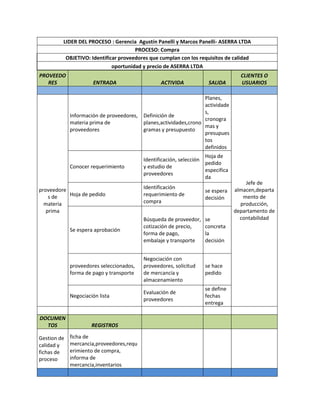 El documento describe el proceso de compra de ASERRA LTDA para identificar proveedores que cumplan con los requisitos de calidad, oportunidad y precio. El proceso incluye la identificación de requerimientos, búsqueda de proveedores, cotización de precios, selección de proveedores, negociación con los proveedores seleccionados y realización del pedido. El objetivo es definir planes, actividades y presupuestos para adquirir la materia prima necesaria de manera eficiente.