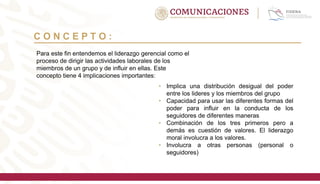 1) El documento habla sobre diferentes teorías del liderazgo, incluyendo teorías basadas en rasgos de personalidad, comportamientos, y situaciones. 2) Explica modelos como el de Fiedler sobre cómo el estilo de liderazgo depende de la situación, y el modelo de Hersey-Blanchard sobre cómo el estilo debe adaptarse al nivel de madurez de los seguidores. 3) También resume conceptos como la teoría X y Y de McGregor sobre estilos de liderazgo directivo vs. participativo, y la teoría del grid