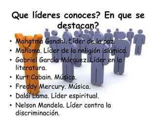 Este documento discute el tema del liderazgo y menciona varios líderes históricos y sus logros. Explica que un líder verdadero guía a los demás a través del ejemplo y la inspiración en lugar de imponer su autoridad. También argumenta que los líderes son importantes para la sociedad porque mantienen el orden y evitan la anarquía.