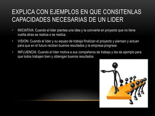 Este documento resume las capacidades necesarias de un líder, incluyendo la iniciativa, la visión y la influencia. Explica que la capacidad de influencia requiere de autocontrol y buen manejo para dar ejemplo a los demás. También asocia el liderazgo con el concepto de autoridad, necesaria para cumplir metas a través de un buen trabajo en equipo. Finalmente, elabora una lista de cualidades fundamentales para un líder como la inteligencia emocional, capacidad de comunicación, innovación y establecimiento de metas.