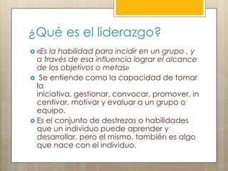 El documento aborda el concepto de liderazgo, describiéndolo como la capacidad de influir en un grupo para alcanzar objetivos. Se exploran diferentes tipos de liderazgo, incluyendo carismático, autocrático, participativo, transformacional y otros, destacando sus características y métodos de influencia. También se analizan las distinciones entre liderazgo formal e informal, así como la importancia de la actitud y habilidades del líder en su eficacia.