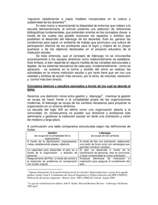 El documento discute el desafío del liderazgo docente en la construcción de una cultura escolar de calidad. Las reformas educativas de los años 90 enfatizaron la gestión y evaluación de resultados, pero los maestros tuvieron poca participación. Se necesita fomentar el liderazgo docente para que puedan contribuir al proyecto educativo de la escuela y lograr cambios en las prácticas. El liderazgo no debe limitarse a los directores, sino involucrar a toda la comunidad educativa.