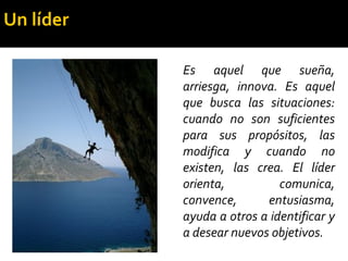 El documento describe las características y comportamientos de un líder efectivo. Un líder es alguien que sueña en grande, toma riesgos e innova para crear nuevas oportunidades. Un líder orienta a otros al comunicar una visión compartida y motivar a las personas a alcanzar nuevos objetivos. Las cinco prácticas clave de un líder son desafiar los procesos existentes, inspirar una visión compartida, habilitar a otros para actuar, servir de modelo e impulsar el compromiso de los demás.