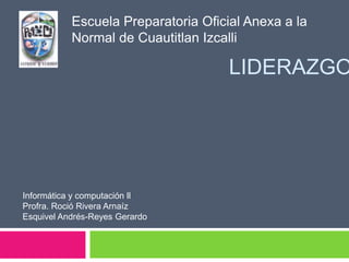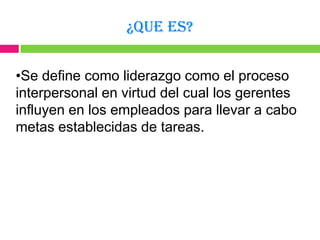 El documento define el liderazgo como el proceso en el que los gerentes influyen en los empleados para alcanzar las metas establecidas. Explica que la misión de un líder es transformar una organización impersonal en una comprometida con sus objetivos. Describe las características de los líderes como tener iniciativa, responsabilidad y enfoque en la resolución de problemas. Finalmente, contrasta dos estilos de liderazgo: uno centrado en las tareas de manera autocrática, y otro orientado a las personas que escucha y ayuda