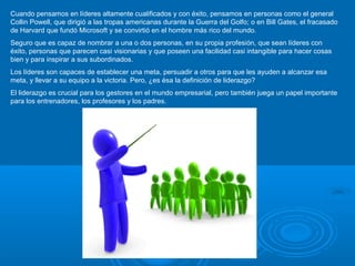 El documento discute las competencias emprendedoras de un líder en una empresa pública o privada. Define el liderazgo como la capacidad de comunicar de manera positiva e inspirar a otros para alcanzar una meta común. Explica que un buen líder necesita conocer bien a cada persona en su equipo para poder motivarlos de manera efectiva. También destaca la importancia de la comunicación entre el líder y sus subordinados para lograr los objetivos de la organización.