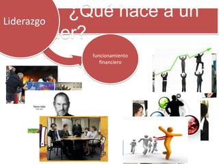 El documento analiza qué hace a un líder efectivo. Explora diferentes estilos de liderazgo y la importancia de la inteligencia emocional para los líderes. Define la inteligencia emocional como la capacidad de controlar las propias emociones y reaccionar adecuadamente a los sentimientos de otros. Finalmente, cita un estudio que encontró que ejecutivos con altos niveles de inteligencia emocional superaron sus objetivos financieros en un 20%, mientras que aquellos con bajos niveles no alcanzaron dichos objetivos