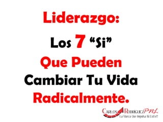 Este documento describe los 7 principios del liderazgo auténtico. El liderazgo no se trata de mandar u controlar a otros, sino de hacerse cargo de uno mismo, enfrentar los desafíos con optimismo y fuerza, seguir persiguiendo las metas a pesar del esfuerzo requerido, celebrar los pequeños logros, dejar atrás culpas y resentimientos, continuar el camino aunque se esté solo, y ver la meta más allá de los obstáculos. El verdadero liderazgo consiste en mirar el futuro con esperanza