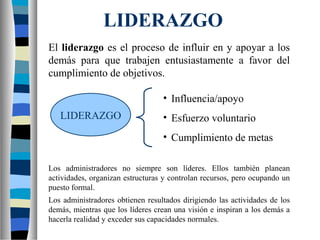 Este documento trata sobre el tema del liderazgo. Explora diferentes teorías del liderazgo como las teorías de los rasgos, las teorías conductuales y las teorías de la contingencia. También analiza conceptos como los estilos de liderazgo, las cualidades de los líderes y la participación en la toma de decisiones. El documento proporciona una visión general de los principales enfoques teóricos para comprender el fenómeno del liderazgo.