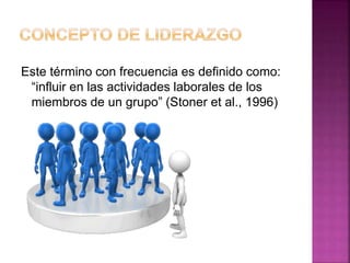 El documento define el liderazgo como la capacidad de influir en los miembros de un grupo para lograr los objetivos organizacionales. Explica que el liderazgo se compone de características personales como la intuición, la visión, la congruencia y la auto comprensión. También describe diferentes estilos de liderazgo como el autoritario, el participativo y el laissez-faire.