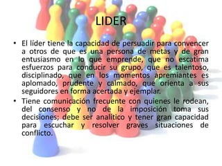 El documento describe las características y cualidades de un buen líder. Un líder eficaz puede persuadir a otros para lograr objetivos comunes, comunicarse efectivamente, escuchar a los demás, y resolver conflictos de manera analítica. Existen diferentes estilos de liderazgo como autócrata, participativo y de rienda suelta. Un buen líder debe tener visión, capacidad para delegar tareas, y motivar a los demás a alcanzar metas.