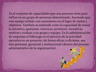El documento define el liderazgo como la capacidad de influir en un grupo para lograr metas y objetivos de manera entusiasta. Esto implica iniciativa, gestión, motivación y evaluación del grupo. En administración de empresas, el liderazgo se refiere al ejercicio de la actividad ejecutiva de forma eficaz y eficiente en cualquier proyecto de una organización.