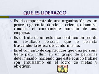 El liderazgo es el proceso de orientar y dirigir a un grupo de personas hacia el logro de metas y objetivos. Un buen líder debe captar la atención de los demás a través de una visión clara, crear significado sobre esta visión mediante comunicación efectiva, y generar confianza posicionándose estratégicamente.