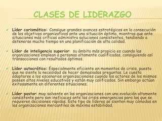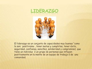 El documento trata sobre el liderazgo. Define el liderazgo como un conjunto de capacidades que influyen positivamente en un equipo o comunidad. Describe varias clases de liderazgo como el líder carismático, líder de inteligencia superior, líder autocrático, líder pastor y otros. También menciona algunos obstáculos comunes para el liderazgo como la pereza, inseguridad y miedo. Finalmente, analiza los beneficios del liderazgo frente a sus posibles déficit.