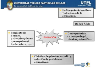 El documento presenta información sobre un curso de maestría en gerencia y liderazgo educacional. El curso analizará las leyes educativas más importantes de Ecuador y desarrollará la capacidad de análisis crítico. También cubrirá temas como el nuevo modelo de gestión educativa y la Ley Orgánica de Servicio Público.