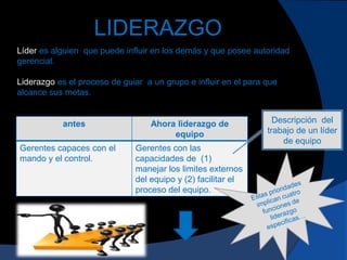 Este documento describe el liderazgo de equipo. Define al líder como alguien que puede influir en los demás y tiene autoridad gerencial. Explica que el liderazgo de equipo implica guiar a un grupo para que alcance sus metas. Describe los roles de un líder de equipo como capacitador, enlace con grupos externos, administrador de conflictos y encargado de resolver problemas. Además, estima que el 15% son líderes de equipo naturales y el 70% pueden aprender a serlo.