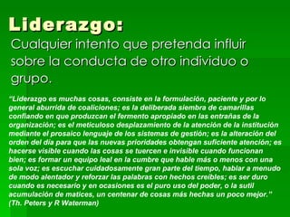 El documento presenta diferentes teorías y modelos de liderazgo. Define liderazgo como cualquier intento de influir en la conducta de otros. Describe características del liderazgo como ser un proceso, orientado a objetivos y que requiere habilidades. También presenta modelos como el de rasgos, conductuales, situacionales y transformacionales.