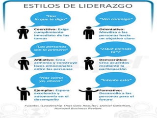 Este documento trata sobre el tema del liderazgo. Define el liderazgo como la influencia interpersonal ejercida en una situación para lograr objetivos específicos, según Chiavenato. También discute otros conceptos de liderazgo, los tipos de liderazgo y comportamientos de líderes, así como ejemplos de líderes como Gandhi y Joan Laporta. Finalmente, incluye algunas frases sobre el liderazgo atribuidas a pensadores como Peter Drucker, Steve Jobs y Napoleón Bonaparte.