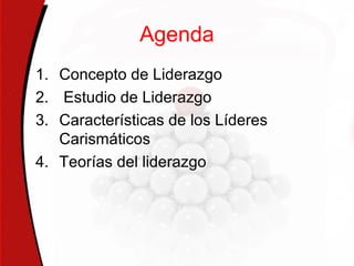 El documento trata sobre el concepto de liderazgo. Explica que no existe una definición única de liderazgo y que los líderes tienen dos tareas principales: establecer una visión y motivar a otros a lograr metas. Luego resume las principales teorías del liderazgo como la teoría de los rasgos, conductual, situacional, de contingencia, de ruta meta y la diferencia entre gerentes y líderes. Finalmente, analiza las características de los líderes carismáticos y los diferentes estilos de liderazgo.