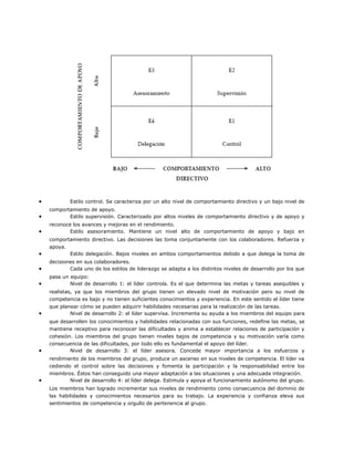 El modelo de liderazgo situacional de Kenneth Blanchard propone que el estilo de liderazgo más eficaz se adapta a las necesidades del equipo en cada situación. Existen cuatro estilos de liderazgo (control, supervisión, asesoramiento y delegación) que se aplican según el nivel de desarrollo del equipo. Un buen líder utiliza comportamientos directivos y de apoyo de manera flexible para motivar al equipo y elevar su implicación a medida que ganan experiencia y competencia.