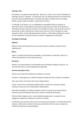 El documento habla sobre el liderazgo ético. Define el liderazgo ético citando el libro "Las 21 Leyes Irrefutables del Liderazgo" de John C. Maxwell. Describe las características de un líder ético como dar el ejemplo, preocuparse por los demás, transmitir confianza y dejar un legado. Luego, presenta una estrategia de liderazgo ético con el objetivo de mejorar el clima organizacional mediante la formación ética, el desarrollo de valores como la honestidad y el compromiso, y la eliminación de