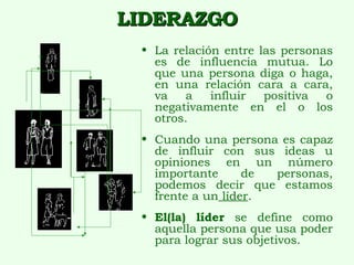 El documento habla sobre el liderazgo y la participación social. Explica que el liderazgo implica influir en otros para alcanzar objetivos determinados. Discuten si los líderes nacen o se hacen, concluyendo que usan habilidades aprendidas. También describe las responsabilidades de un líder de una organización de adultos mayores como facilitador, orientador, educador y organizador. Finalmente, enumera las habilidades que debe tener un líder como conceptuales, técnicas, para trabajar con grupos humanos y de gestión.