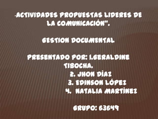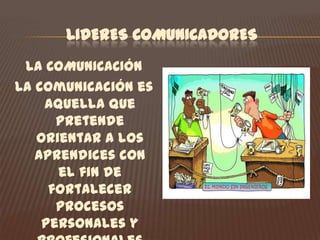 Este documento presenta diferentes tipos y usos de la comunicación como herramienta para fortalecer procesos personales y profesionales en aprendices del SENA. Describe la comunicación oral, corporal, escrita y a través de internet, destacando que permiten expresar opiniones, transmitir conocimientos, desarrollar habilidades comunicativas y resolver conflictos de manera asertiva. El objetivo es que los aprendices se comuniquen adecuadamente y con confianza ante diferentes públicos.