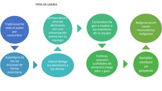 Este documento define el liderazgo y describe las cualidades de un líder efectivo. Un líder es alguien que puede influir en otros para alcanzar metas comunes a través de su carisma, comunicación, responsabilidad, visión y actitud positiva. También describe diferentes tipos de liderazgo como tradicional, autoritario, liberal, democrático y carismático.