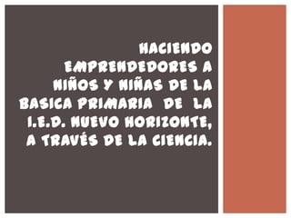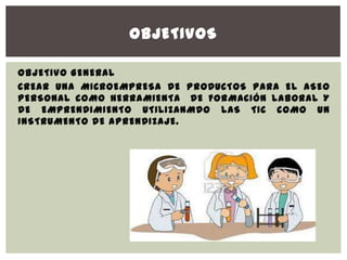 El proyecto busca mejorar el aprendizaje de química en niños de la I.E.D. Nuevo Horizonte mediante la creación de una microempresa de productos de aseo personal, utilizando TIC como herramienta educativa. Se identificaron dificultades en la motivación hacia la química y se establecieron objetivos específicos para fomentar el interés y la comprensión de los conceptos. La implementación del proyecto se evaluará a través de la ejecución de actividades y la creación de productos, destacando el papel esencial de las TIC en el proceso de formación.