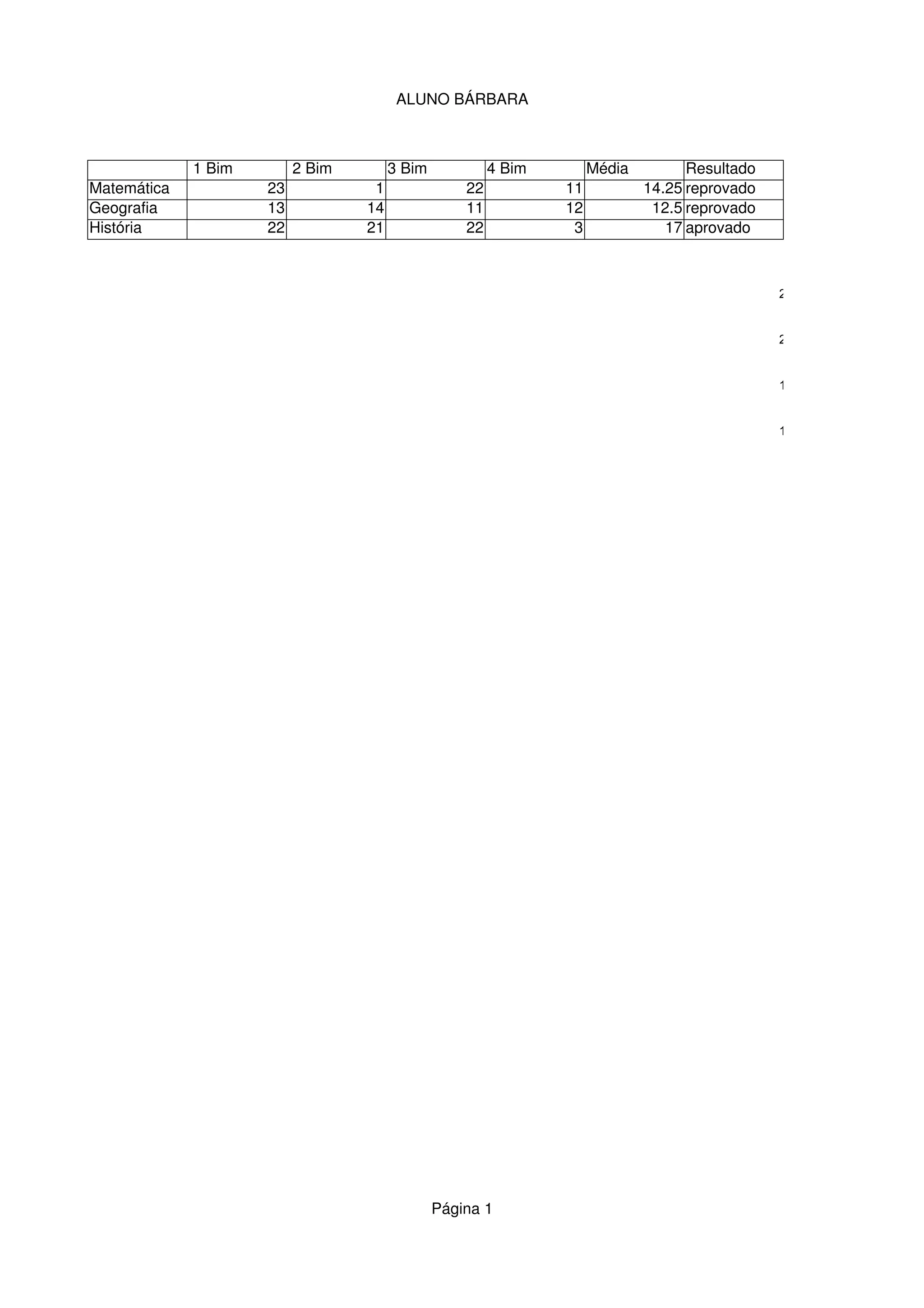 El documento presenta los resultados académicos de una estudiante llamada Bárbara en tres asignaturas: Matemáticas, Geografía e Historia durante cuatro bimestres. En Matemáticas y Geografía, la estudiante fue reprobada con promedios de 14.25 y 12.5 respectivamente, mientras que en Historia fue aprobada con un promedio de 17. El documento también incluye dos gráficos de barras que muestran las calificaciones obtenidas en cada asignatura por bimestre y el promedio general.