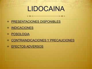 Este documento proporciona información sobre la lidocaína, incluyendo sus presentaciones disponibles, indicaciones, posología, contraindicaciones, precauciones, efectos adversos y tratamiento de sobredosis. La lidocaína se usa comúnmente para producir anestesia local o regional mediante infiltración o bloqueos nerviosos. Se debe evitar en casos de hipersensibilidad o shock y monitorear dosis repetidas para prevenir efectos sistémicos. Las reacciones adversas incluyen síntomas neurológicos, cardiovasculares o al