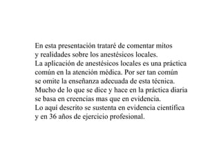 Este documento trata sobre los mitos y realidades de los anestésicos locales como la lidocaína. Explica que la lidocaína actúa bloqueando los canales de sodio en las fibras nerviosas y que su efecto anestésico se conserva incluso al diluirla, siempre que se aplique el volumen suficiente. También destaca la importancia de amortiguar el pH ácido de la lidocaína y calentarla para reducir el dolor al aplicarla.